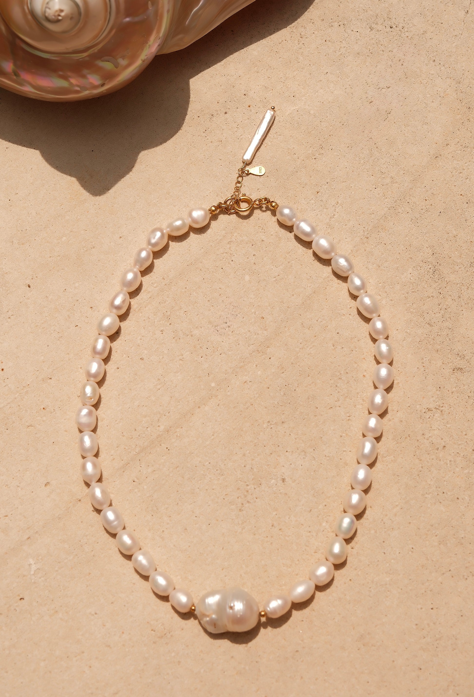 Soft as a sea breeze, unique as the pearl that carries its whisper. This handmade necklace is thoughtfully composed of irregular ivory freshwater pearls and a central baroque pearl. Every element tells its own story — no two are ever the same.