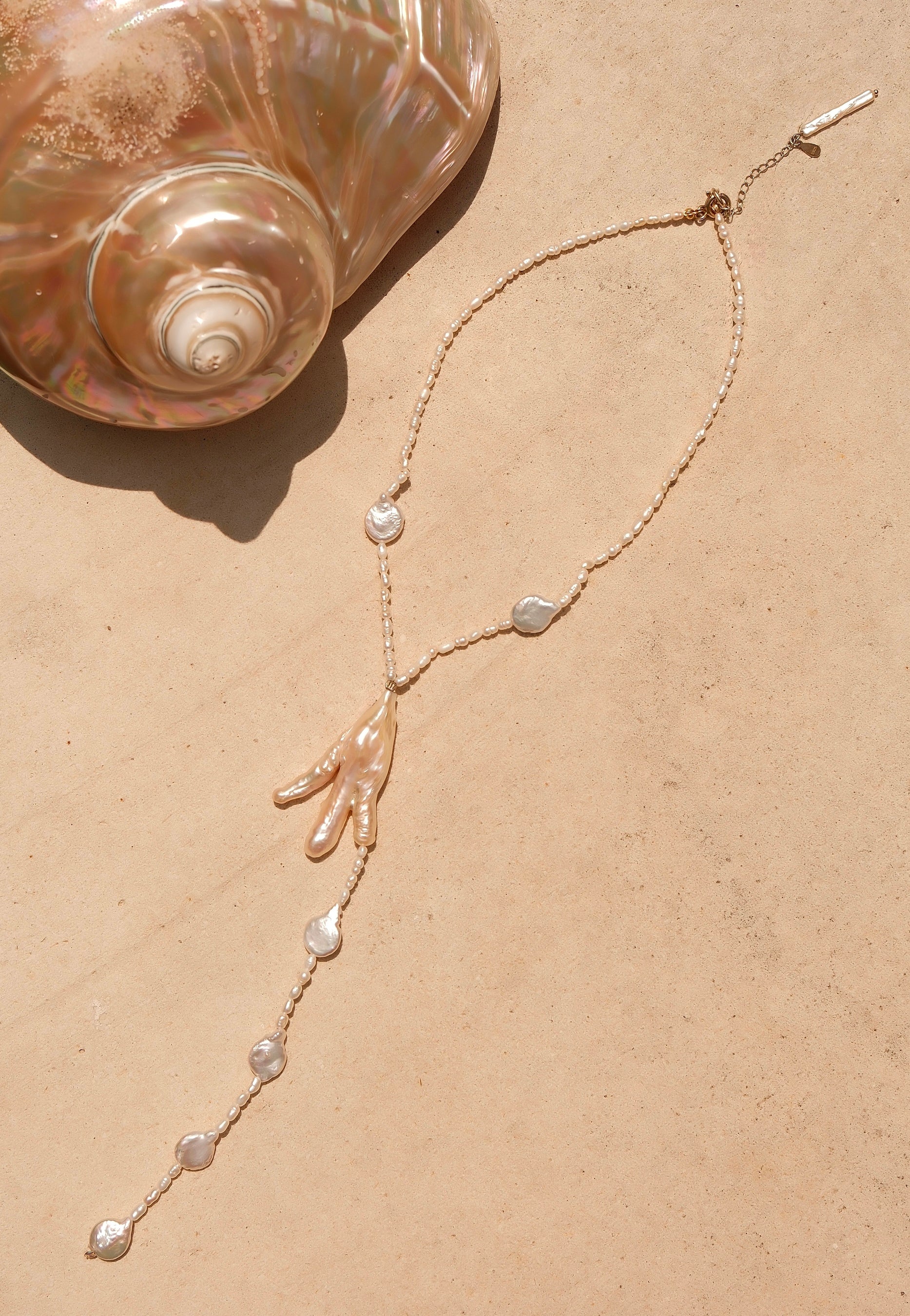 Soft as a sea breeze, unique as the shell that carries its whisper. This handmade necklace is thoughtfully composed of irregular freshwater pearls and a special accent of a blush sculptural baroque pearl. Every element tells its own story — no two are ever the same.